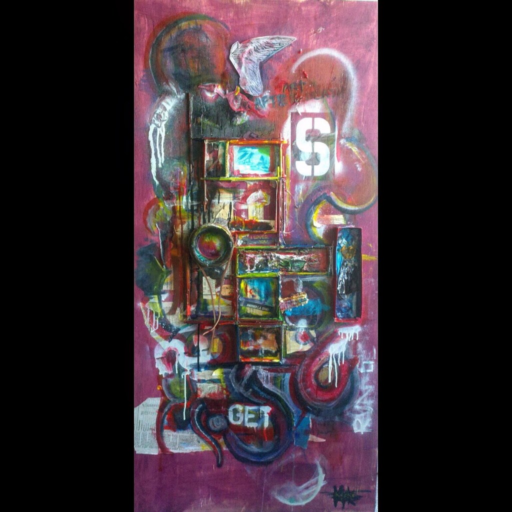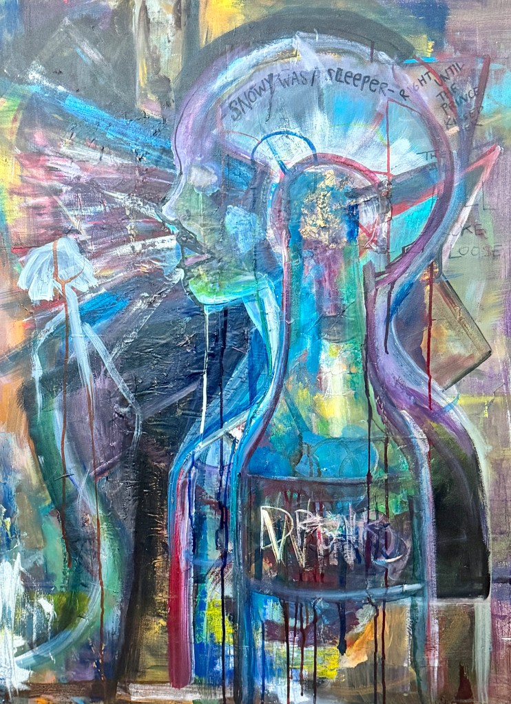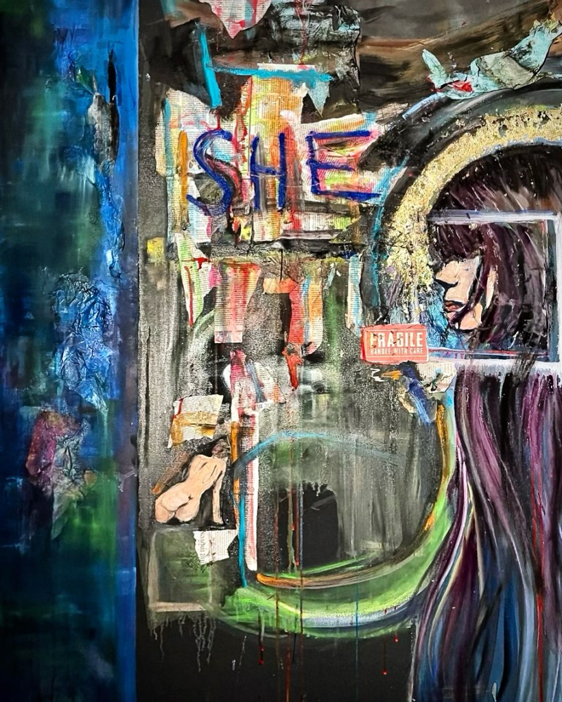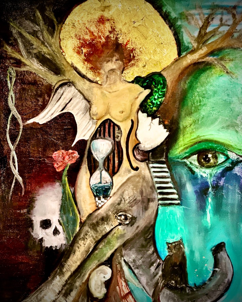 Creating art is how I survive. If I didn’t have art I would be dead. Life builds up inside of me: life and love, the good, the bad, the fucked up, myself, the cycle of creation and destruction, and constant change, and the things we cannot change. It builds up until I feel like I’m going to explode, then I purge myself by exploding safely onto the canvas. It’s all very bittersweet. I use all mediums, painting, drawing, collages, sculpting, mosaics, jewelry making, depending on my mood. I use acrylic, oil, watercolor, charcoal, graphite, paper, clay, textiles, wax, and anything I can find. I started drawing when I was about 2 years old, and I started painting at 11, and everything else I picked up along the way. Art just turns me on. I like the way it *feels* painting and sculpting. There’s little to no thought about what I’m creating. I’m an emotional painter. I’m not painting an idea, but I’m painting the emotion that comes with an idea. It’s pure inspiration that flows freely out of me. When the canvas is empty, it is pure, and I want to corrupt it. I want to pull the emotion out…
